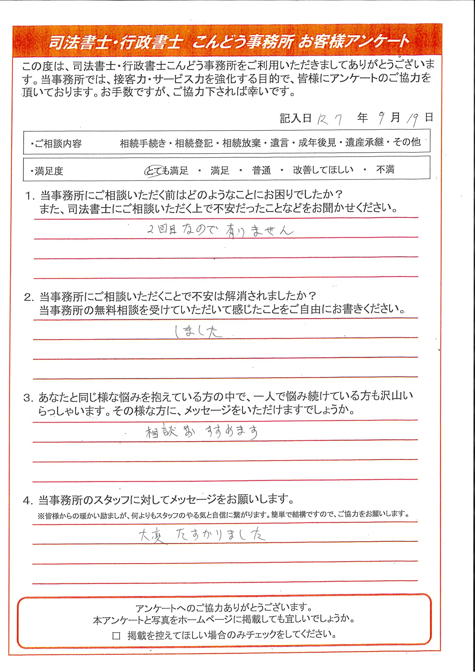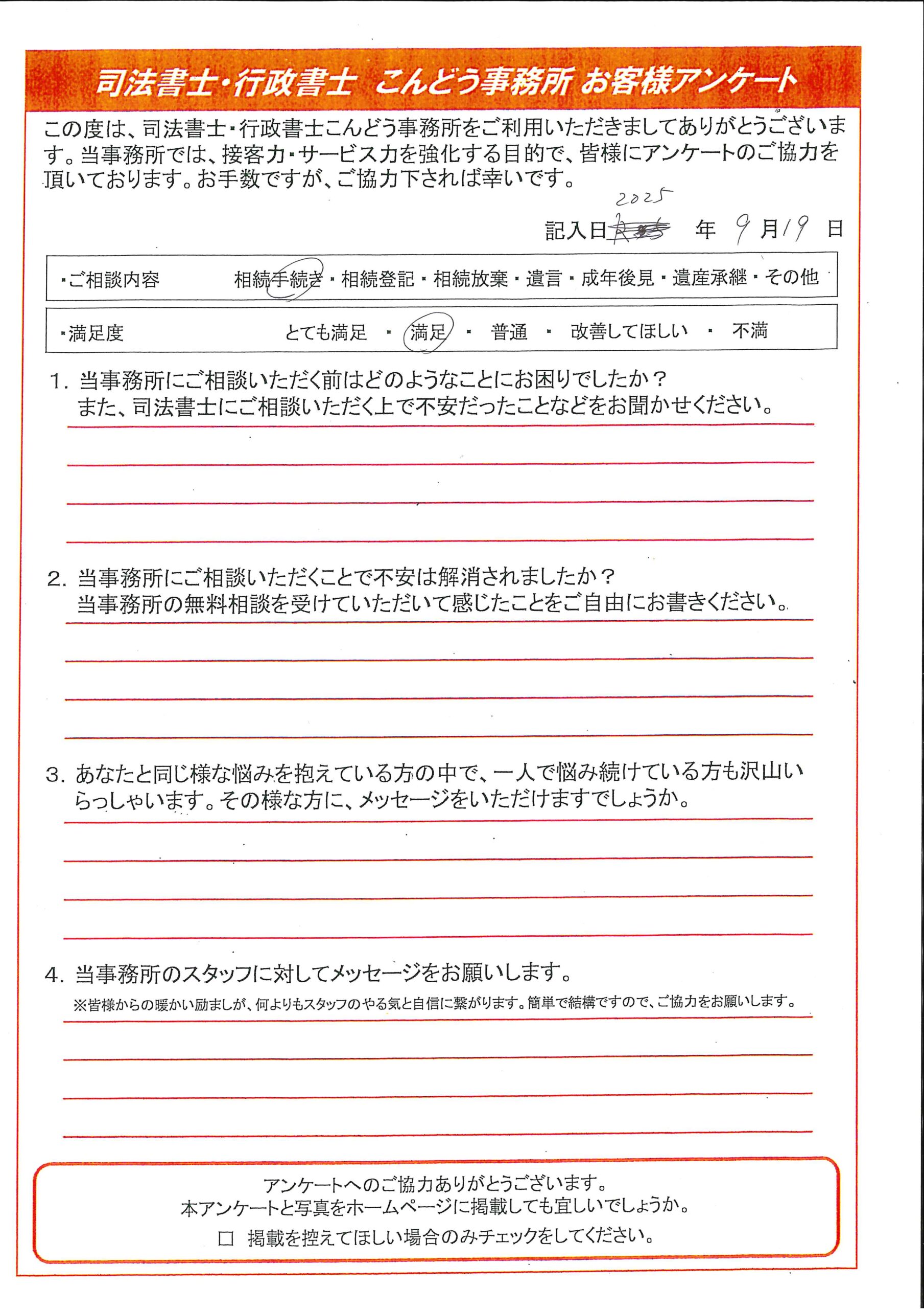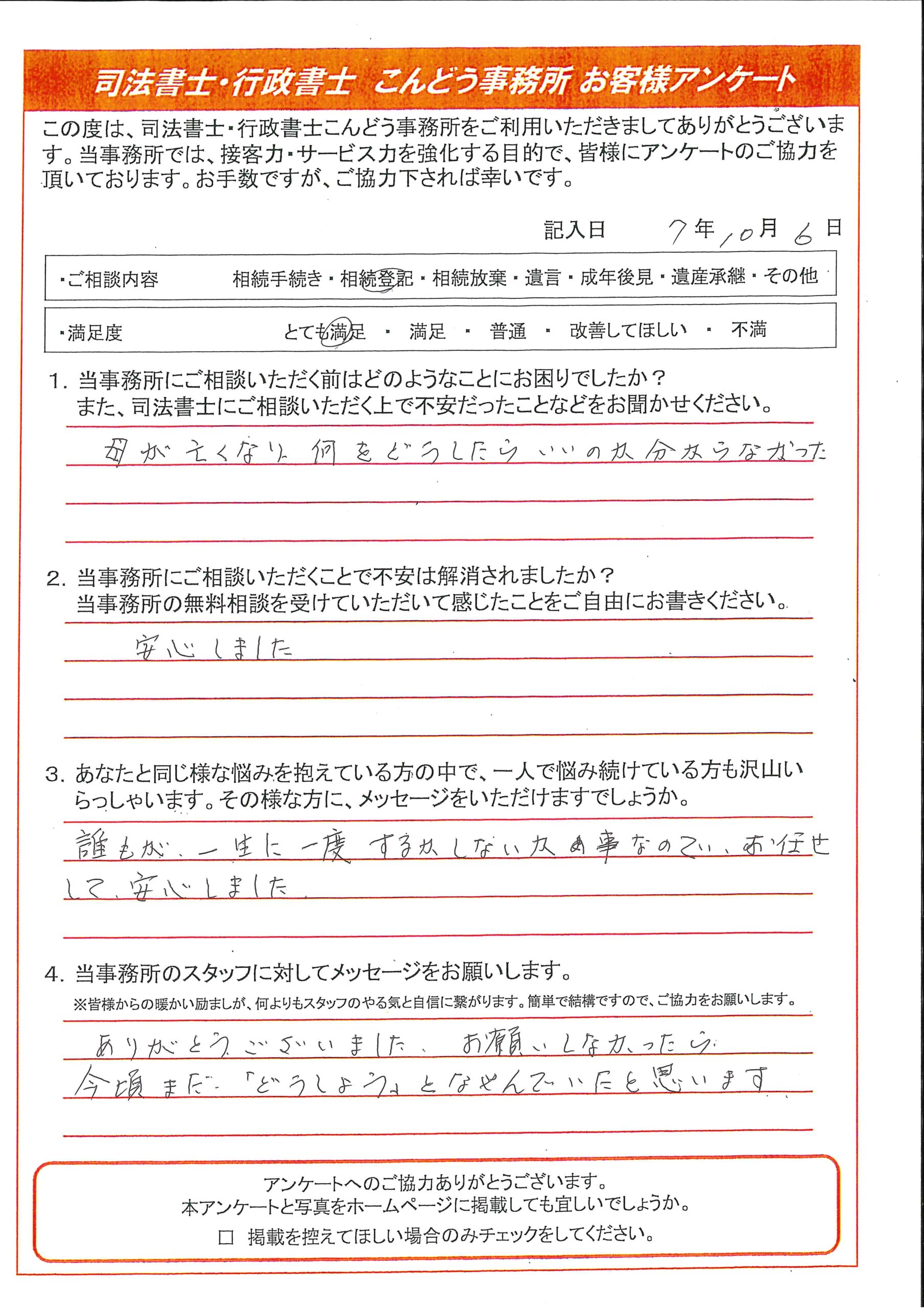 今後は遺言書作成に関しましてもご依頼申し上げ所存です。本当にご指導並びに諸手続ありがとうございました。感謝の一念でございます。