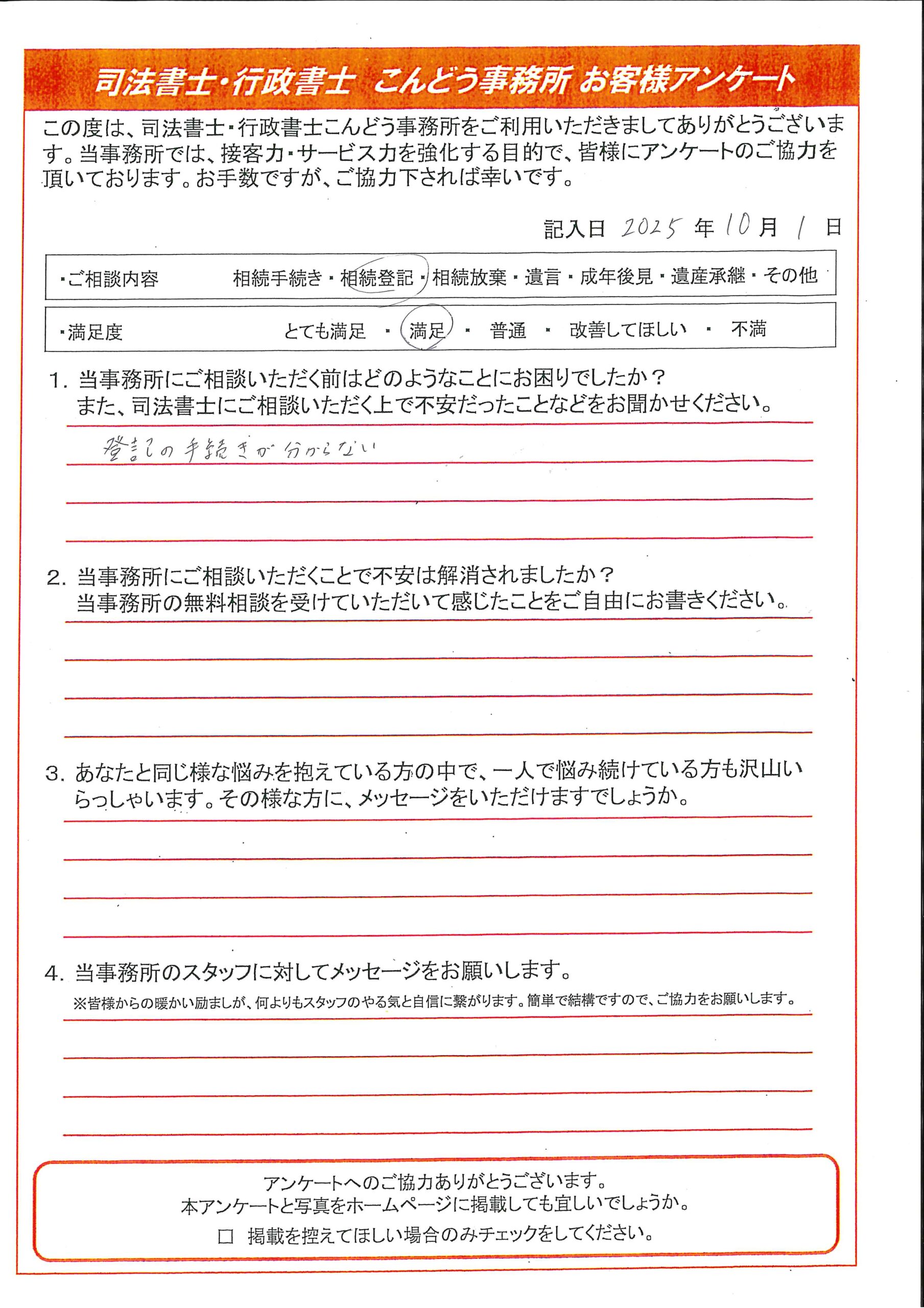 どのように相続をすすめた方がいいのか、手続きをすすめた方がいいのか、全然わからない事が不安でした。